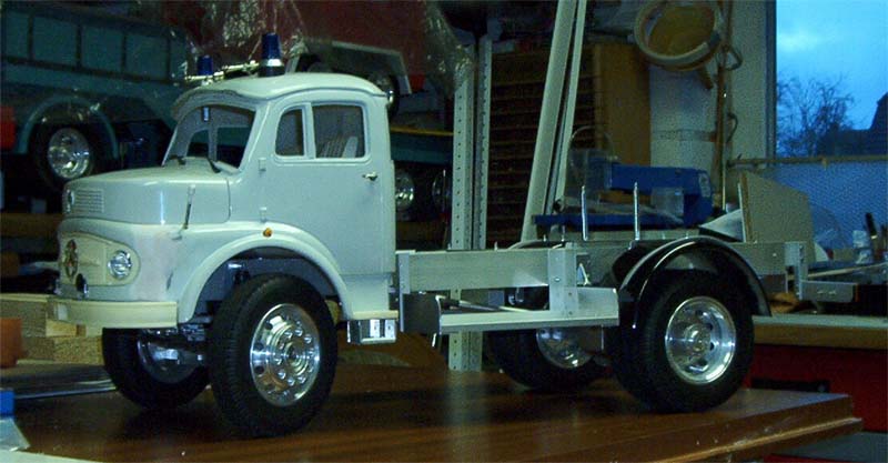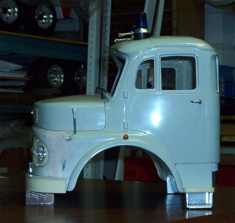 Stoßstange neu angepasst, Einstieghilfe angebaut, Rundumleuchten, Signalhörner, Peilstangen, Seitenblinker und Türgriffe montiert