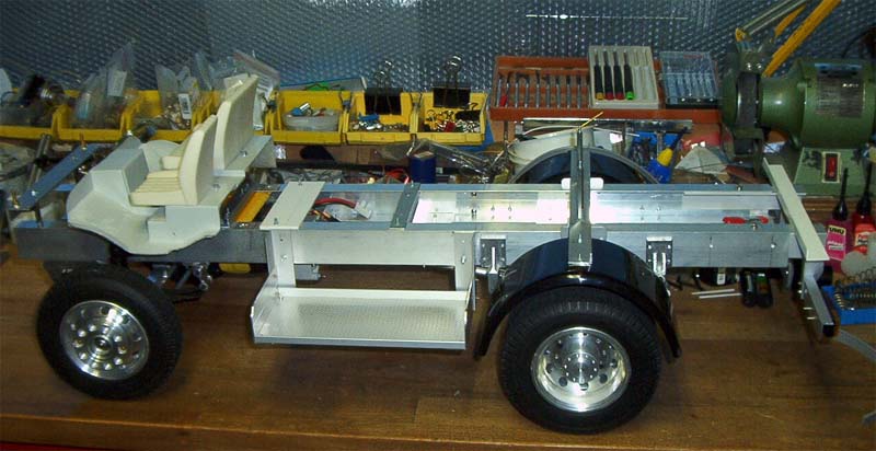 Rahmen aus Aluminium angefertigt, Vorder und Hinterachse montiert, Bodenplatte mit Sitze angepasst, Staufach für Saugschläuche und hintere Stoßstange angebaut, hintere Kotflügel aus Kanalrohrdeckel montiert