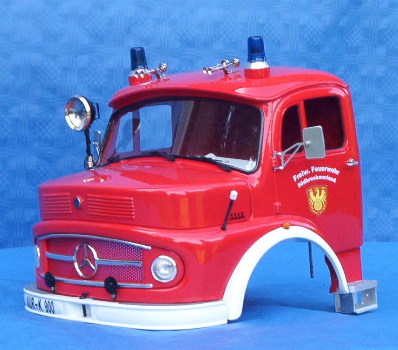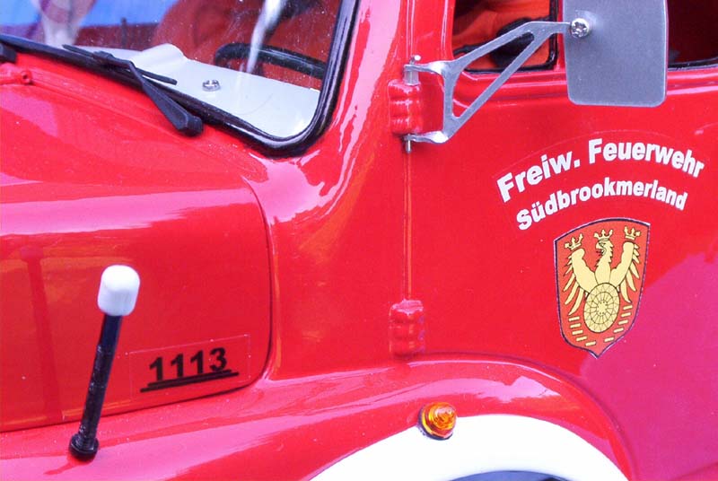 hier sieht man die Spiegel, das Wappen von der Freiwilligen Feuerwehr Südbrookmerland, Seitenblinker, Peilstangen und Typenbezeichnung der Mercedes Benz AG